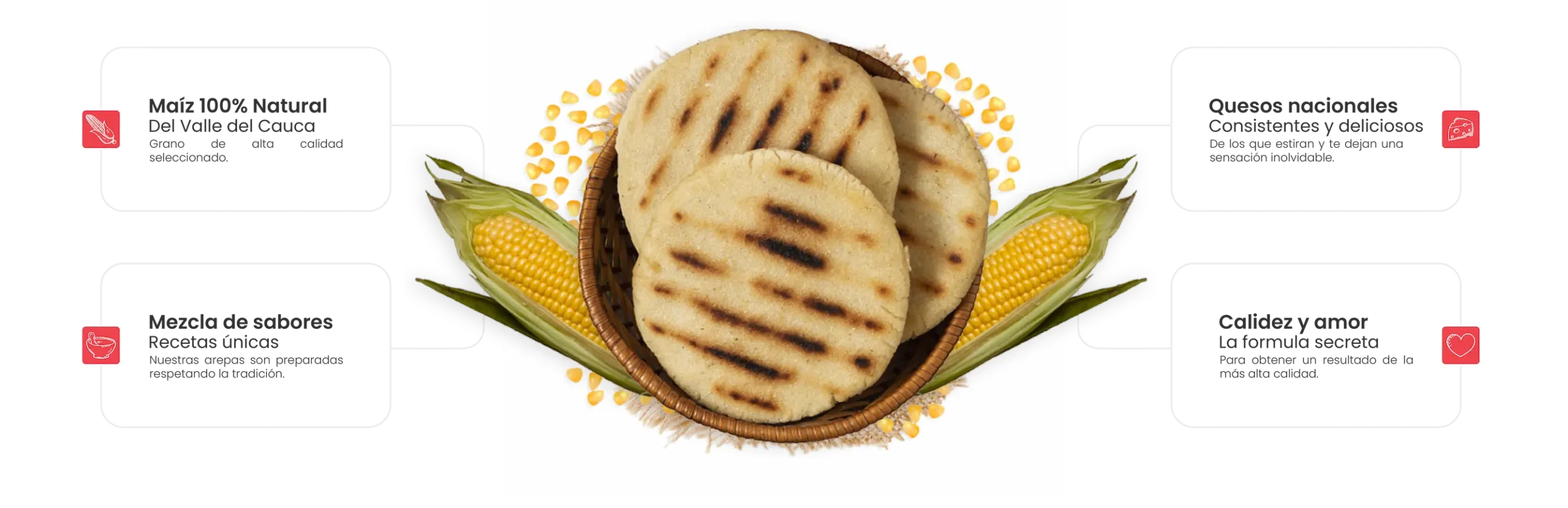 Explora nuestras arepas rellenas de queso, clásicas, integrales y saludables, elaboradas con maíz 100% natural. Cuatro formas de vivir la tradición con sabor auténtico.
